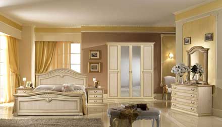 Набор мебели для спальни «Наоми». Спальный гарнитур в классическом стиле завораживает элементами, подчеркнутыми изысканной позолотой, создавая обстановку интима и нежности. Цена набора с 4-х дверным шкафом 80 955 руб.