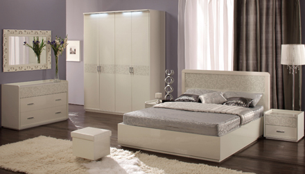 Цвет: белый, бронза. Коллекция «Белла» разработана итальянскими дизайнерами. Современная и модная тенденция белого цвета в глянце дополняется легким декором светло-серебряной шелкографии стилизованного русского орнамента. Возможны модификации в других цветах. Корпус — лакированная ЛДСП 18 мм, 25 мм. Фасад — лакированная ЛДСП 18 мм с матовой светло-серебряной шелкографией, зеркала с шелкографией. Как вариант, мягкая панель головной спинки, инкрустированная кристаллами Swarovski. Система направляющих Push-to-open. LED подсветка шкафа. Итальянские хромированные ручки с оригинальными кристаллами Swarovski. Кровать с подъемным механизмом. Такая комната может стать отличным местом, чтобы отдохнуть и восстановить силы после напряженного рабочего дня. Успокаивающий белый цвет поможет Вам расслабиться и откинуть прочь мысли о повседневных заботах. В каталоге Вы также сможете найти различные зеркала для спален.