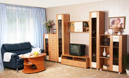Комплект корпусной мебели для гостиной «Омега». Набор мебели для гостиной из ЛДСП. Возможно два цветовых решения: «Бук Бавария» полностью или «Бук Бавария» в сочетании с кремовым цветом. Модульная система комплектации. Производство: ООО «Карат-Е» г.Екатеринбург. Цена 20 540 руб.