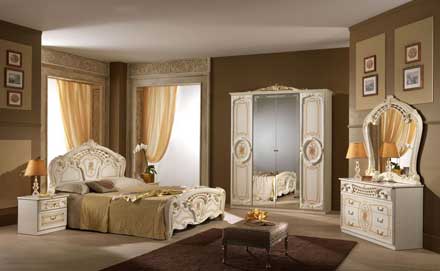 Набор мебели для спальни «Памела» Спальный гарнитур в стиле Барокко. Нанесенная на фасады шелкография, покрытая лаком, придает набору особую элегантность. В качестве отделки используются элементы из пенополиуретана. Цена набора с 4-х дверным шкафом 65 560 руб.