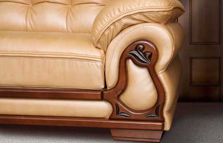 Размеры дивана и кресла   Технические характеристики Механизм трансформации – «Sedaflex» c пружинным матрацем. Каркас изготовлен из фанеры березовой, березы, сосны, ДВП. Сиденья и спинка изготовлены из контурного пенополиуретана 35 плотности. Декоративные изделия выполнены из березы с полиэфирным покрытием, ручная резьба.